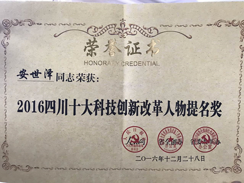 院長安世澤獲 “2016四川十大科技創(chuàng)新改革人物”提名獎