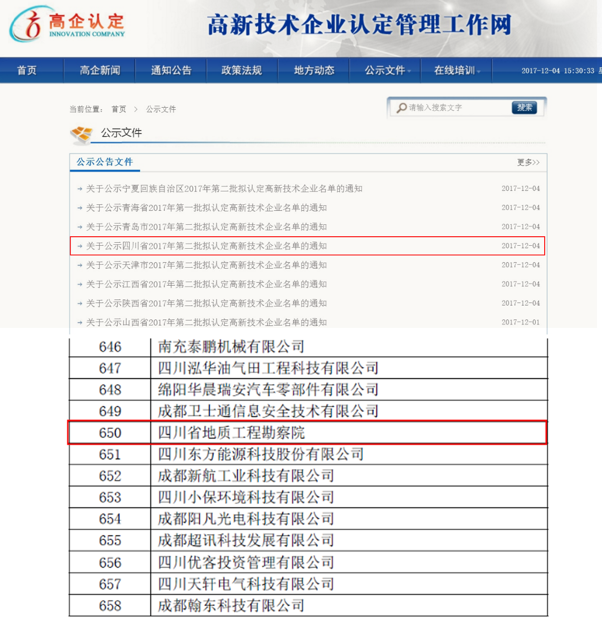 12月4日,國家高新技術企業認定官網發布了“四川省2017年第二批擬認定高新技術企業的公示名單”,四川地質工程勘察院名列其中,榮膺高新技術企業認定