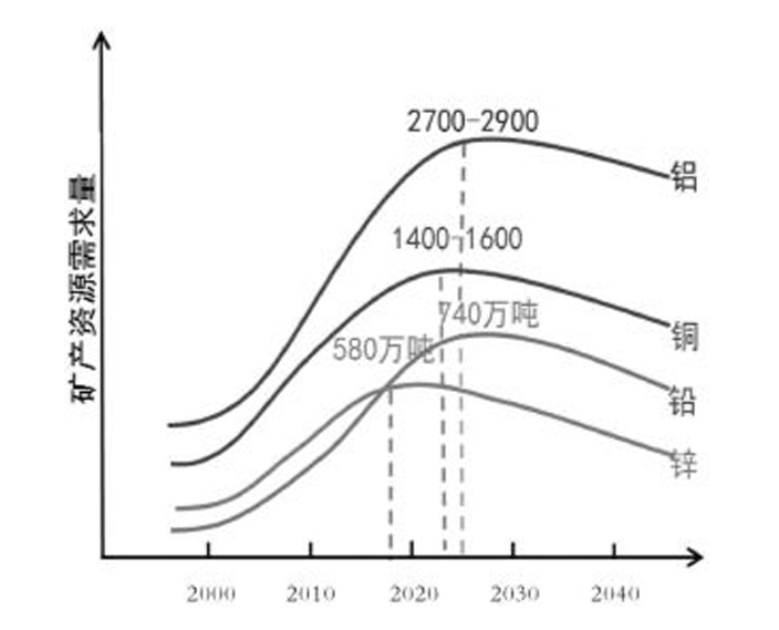 王安建教授預測,達到峰值的礦產需求總量會很高。預計鋼鐵消費的峰值大致是在7億噸~7.5億噸;能源消費的峰值大約出現在2030年,大約消費40~42億噸;我國銅的消費峰值大致在2022~2025年,大約消費1300萬噸~1500萬噸;鋁的消費峰值大致在2022~2025年, 消費2700萬噸~2900萬噸;鉛、鋅的消費峰值大致在2022年左右,鉛大約消費680萬噸~700萬噸,鋅大約消費770萬噸~790萬噸。